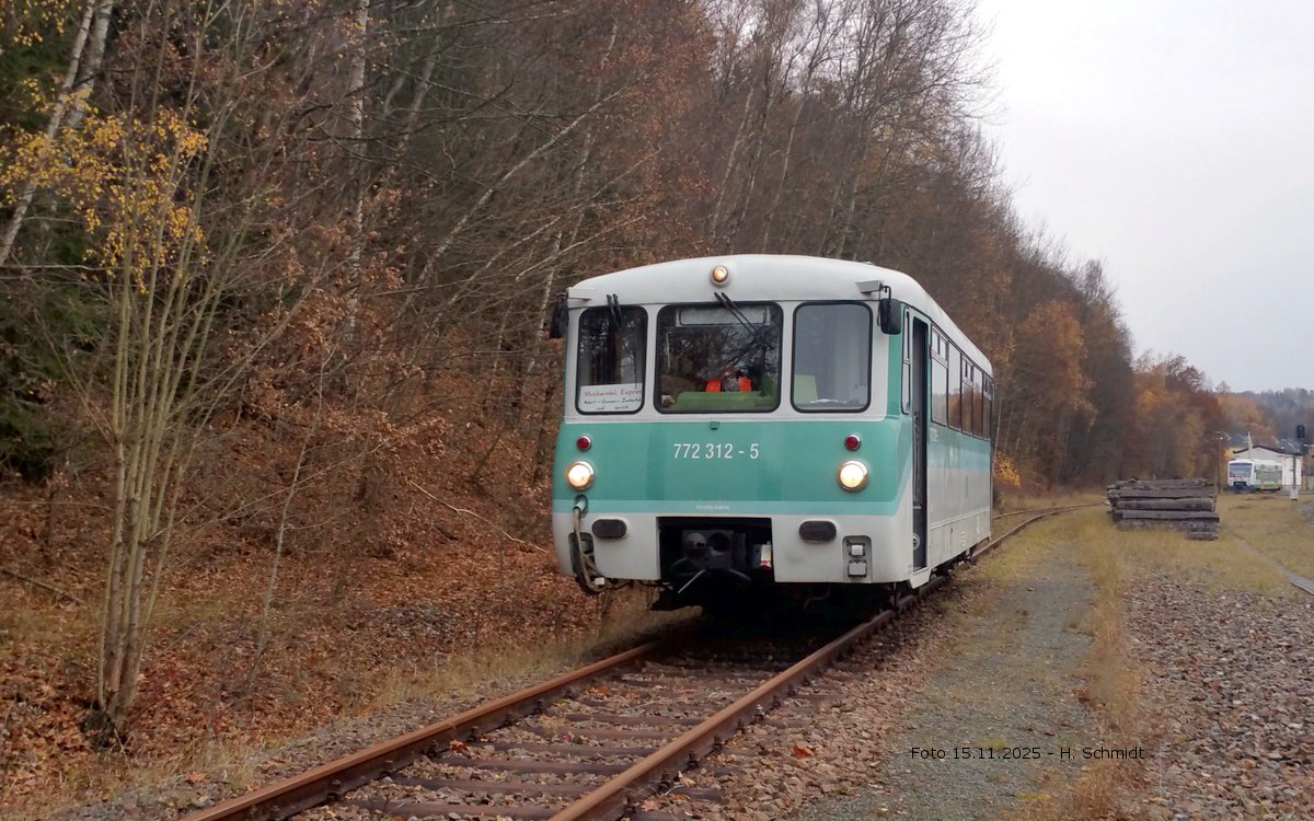 Die Eisenbahnnostalgie Vogtland war am 15. und 16. November 2025 zwischen Adorf und Zwotental zu Sonderfahrten für den OVEB e.V. im Einsatz.