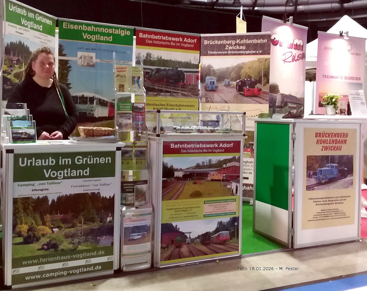 In der Stadthalle Zwickau, auf dem Stand von "Camping & Ferienhäuser von Tailleur", gabt es Flyer und aktuelle Info's zur Eisenbahnnostalgie Vogtland, zum Bw Adorf im Vogtland und zur Brückenberg-Kohlenbahn Zwickau.