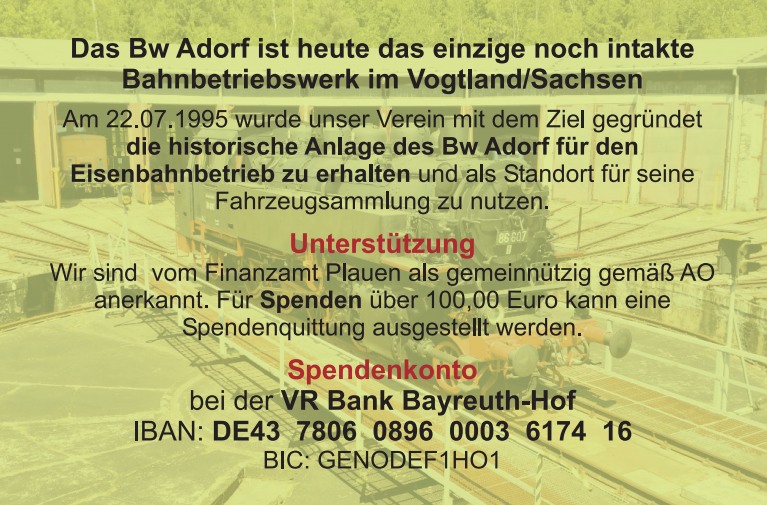 Der Vogtländische Eisenbahnverein Adorf e.V. erhält und betreibt seit 1995 in ehrenamtlicher Tätigkeit die Anlagen des Bw Adorf. Der Verein erhält und pflegt neben den baulichen Anlagen und vielen eigenen Fahrzeugen die 86 607 des Verkehrsmuseums Dresden.