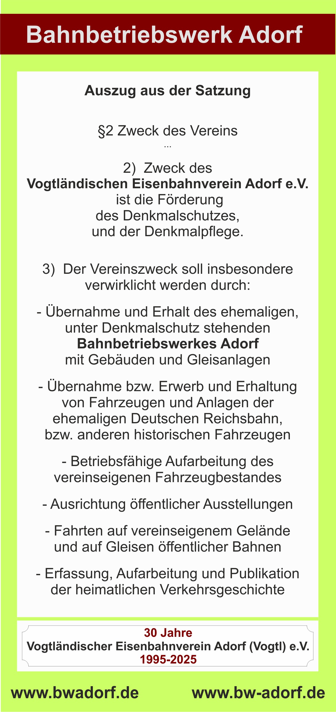 Der Vogtländische Eisenbahnverein Adorf e.V. erhält und betreibt seit 1995 in ehrenamtlicher Tätigkeit die Anlagen des Bw Adorf.